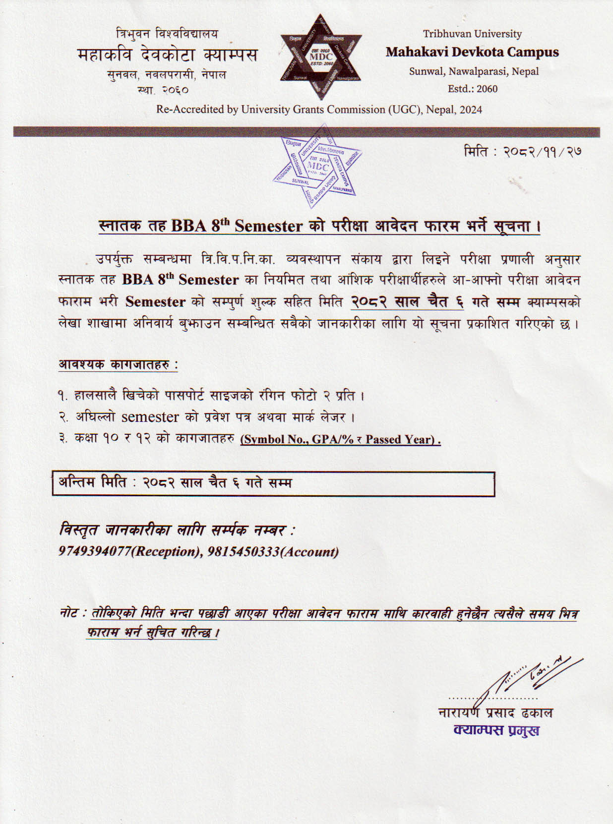 BBA 8th Sem Exam Form Fillup Notice