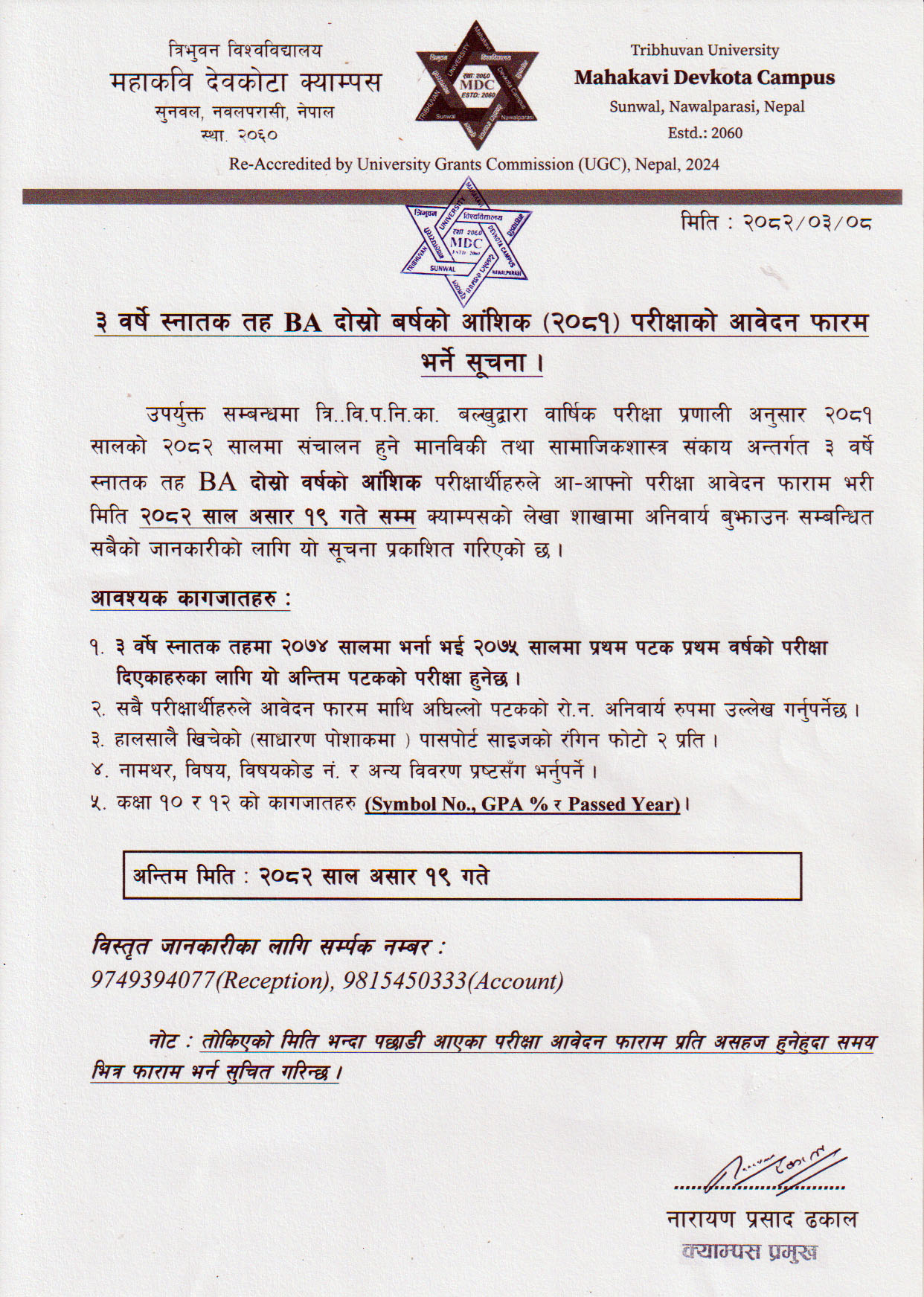 Exam Form Fillup Notice to 3 years BA 2nd year partial 2081 (2082)