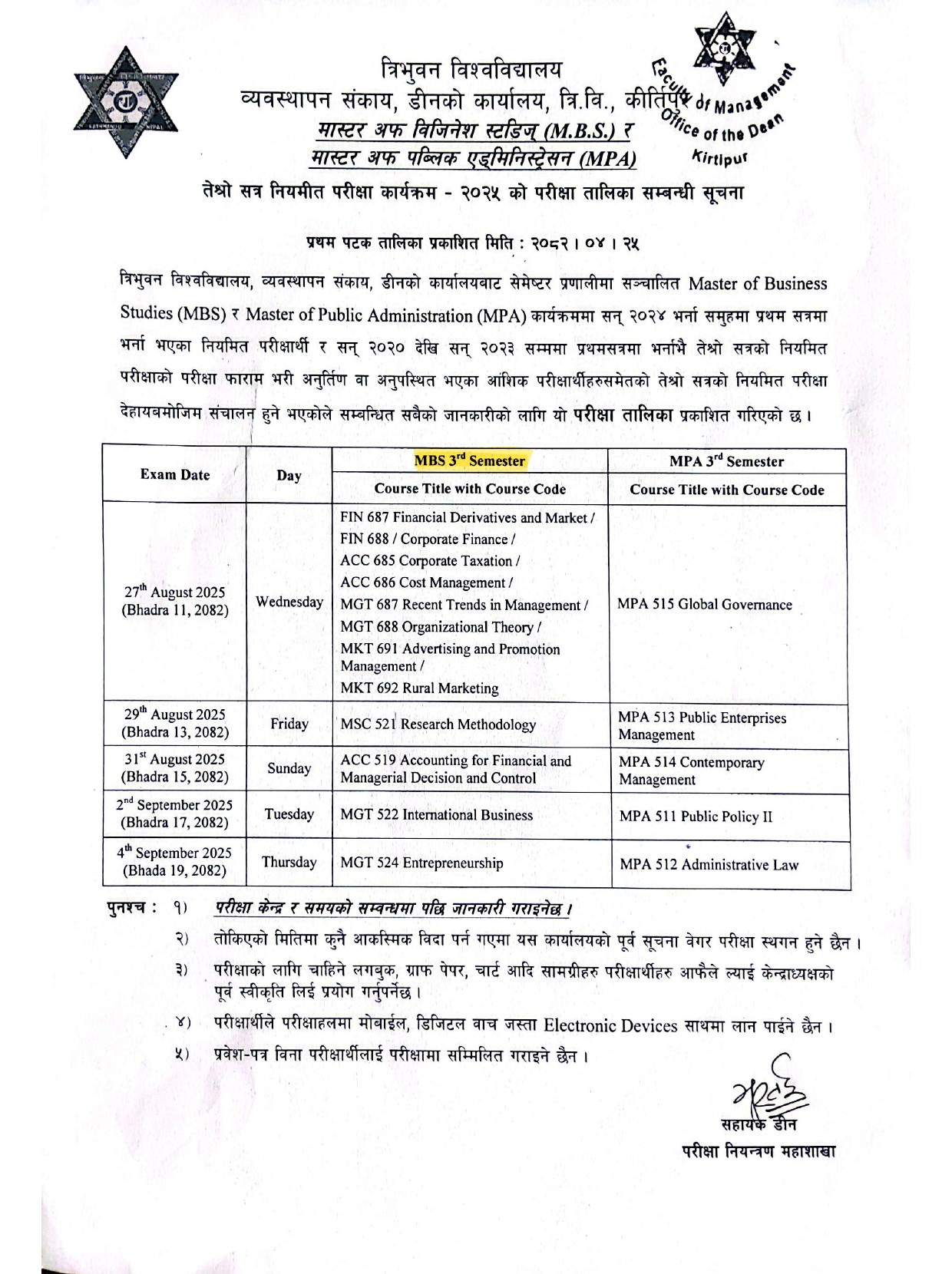 MBS 3rd Semester Board Examination Routine